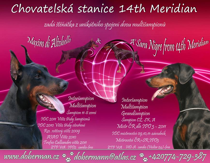 27.04.2012 13:37Casiova maminka A'Sara Nigre from Fourteenth Meridian čeká další miminka! Velmi očekávaný vrh D v chovatelské stanici Fourteenth Meridian by měl přijít na svět okolo 20. května. Tatínkem štěňátek je velmi úspěšný a známý dobrman Maxim di Altobello. V tomto vrhu je předpoklad skvělých exteriérů i povah! Neváhejte a rezervujte si své štěňátko již nyní :o)